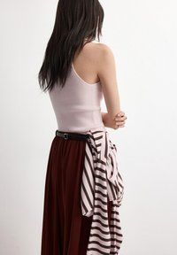 Femme aux longs cheveux bruns portant de grandes lunettes de soleil marron, un haut sans manches rose côtelé, une écharpe rayée nouée autour des épaules, une jupe bordeaux et une ceinture noire.