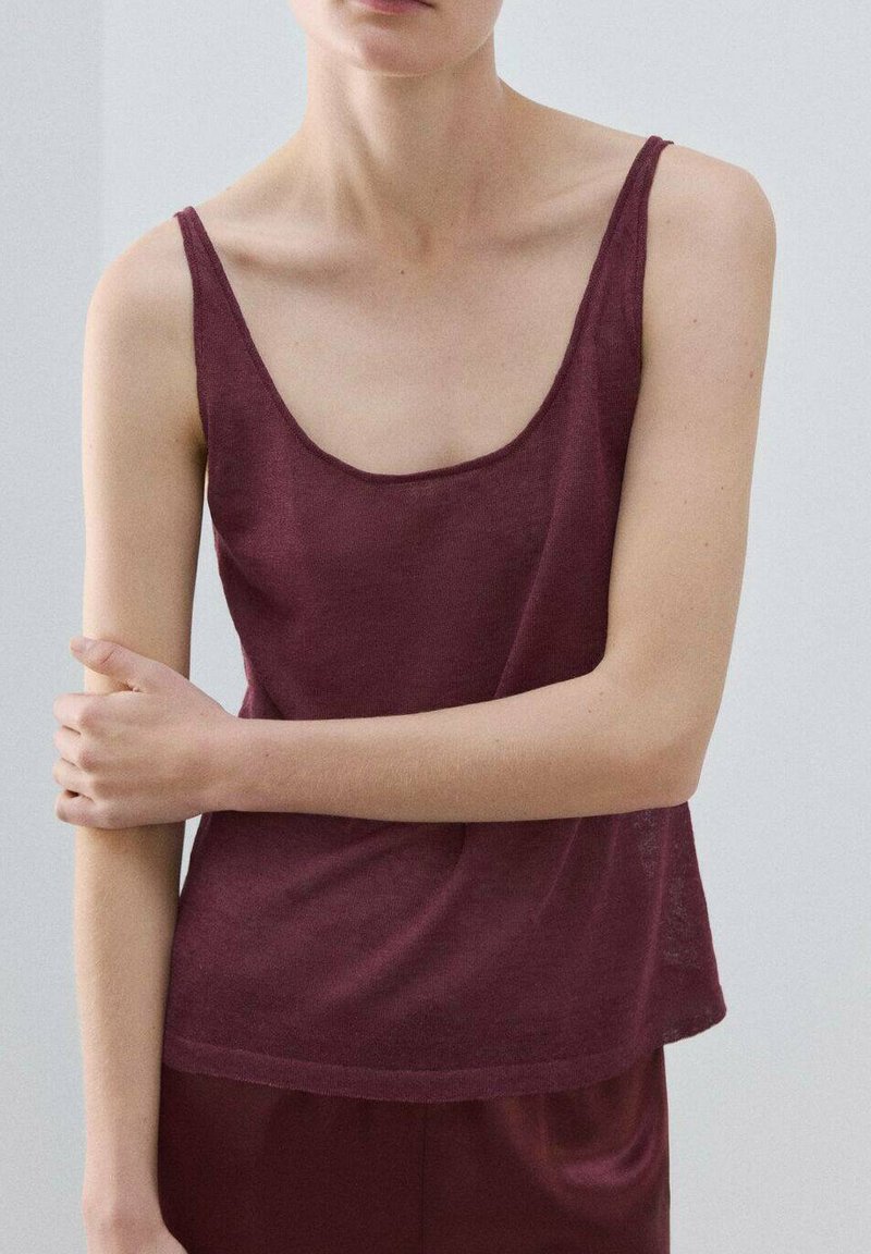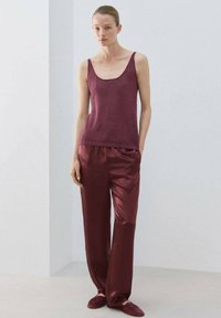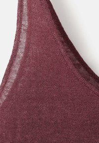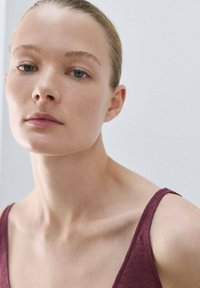 Personne portant un haut sans manches bordeaux et un pantalon assorti, avec un bras tenant le coude opposé, sur un fond uni.