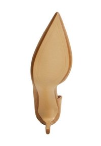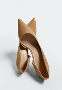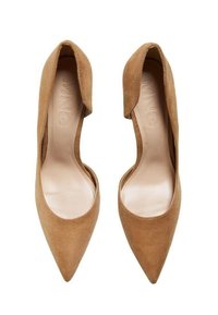 Pompe à talon aiguille en suede beige clair à bout pointu, avec un talon haut et des côtés dégagés, présentée en profil sur un fond blanc.