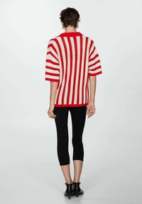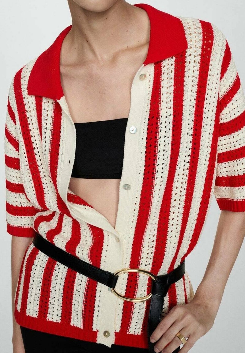 Personne portant un cardigan en maille rayé rouge et blanc par-dessus un crop top noir, avec une ceinture noire ornée d'une grande boucle ovale dorée.