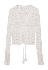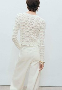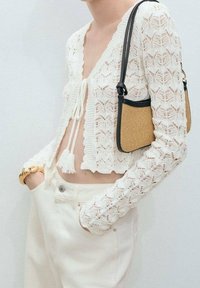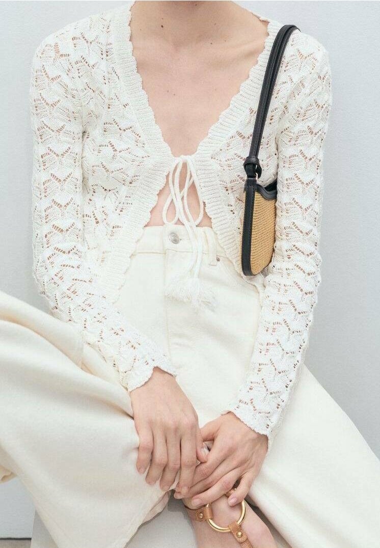 Personne portant un haut court à manches longues en crochet blanc, un pantalon crème taille haute, tenant un sac à bandoulière tissé beige et noir.