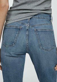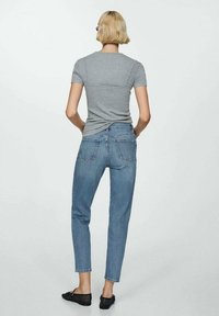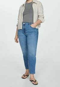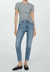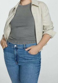 Femme portant un jean taille haute bleu clair, un haut sans manches gris et des ballerines noires, se tenant contre un fond clair uni.