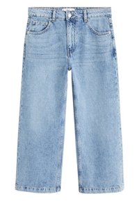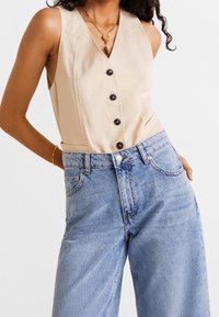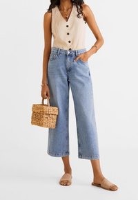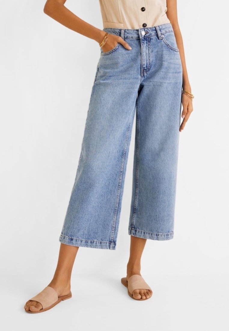 Jean denim bleu clair à jambes larges avec une taille haute, doté de poches avant et d'un ourlet net. Porté avec des sandales plates beige à enfiler.