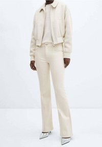 Personne portant un pantalon flare ajusté couleur crème, un pull crème et des chaussures à talons hauts pointues argentées, debout devant un fond uni.