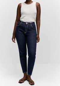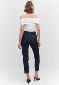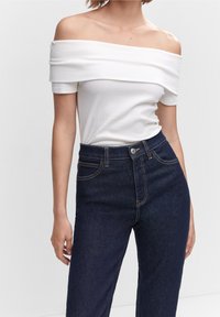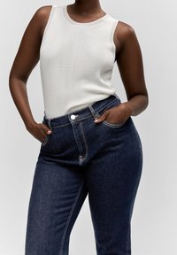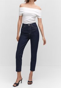 Femme portant un jean slim taille haute bleu foncé, un haut blanc à manches courtes et des mules à talons hauts ouvertes noires, se tenant debout avec une main dans la poche.