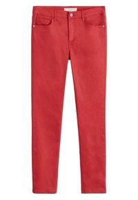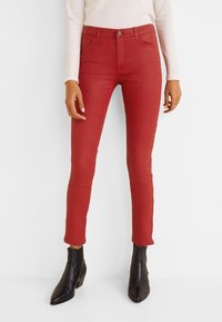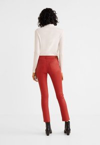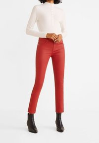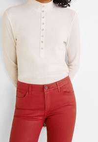 Femme portant un pantalon rouge ajusté, un haut beige à manches longues et des bottines noires, debout devant un fond blanc.