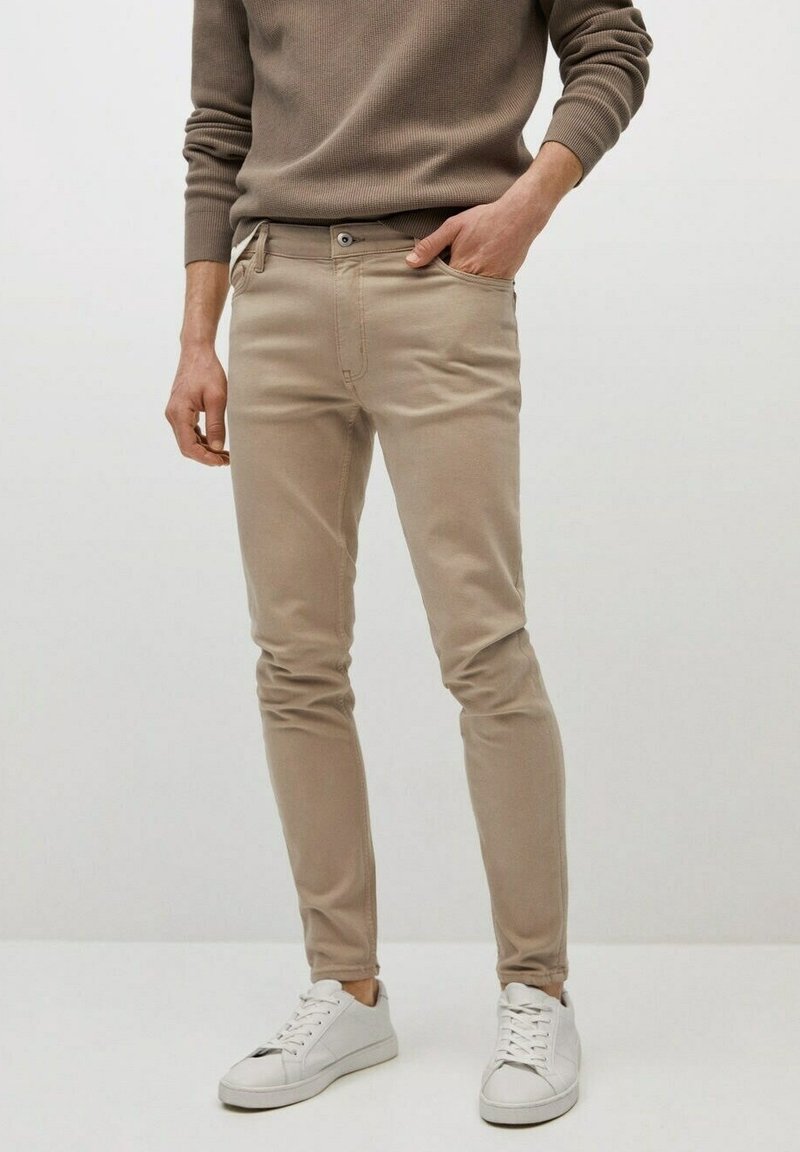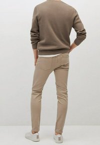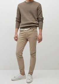 Homme portant un pantalon beige slim, un pull marron et des baskets blanches, debout avec une main dans la poche sur un fond uni.