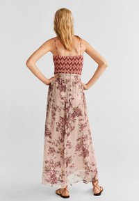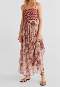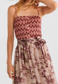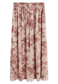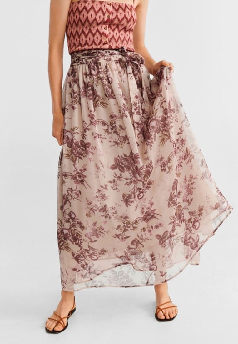 Jupe longue en tissu léger beige transparent avec un motif floral dans des tons de rose et de marron. Taille nouée et silhouette fluide.
