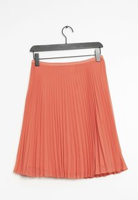 Jupe plissée corail, en tissu léger. Elle présente une taille cintrée et s'arrête au milieu du mollet, avec des plis réguliers sur toute la surface.