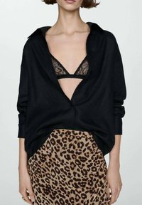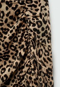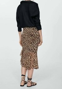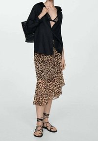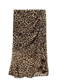 Jupe midi à imprimé léopard avec un ourlet fluide et volanté. Fabriquée en tissu léger. Associée à des sandales noires à brides.