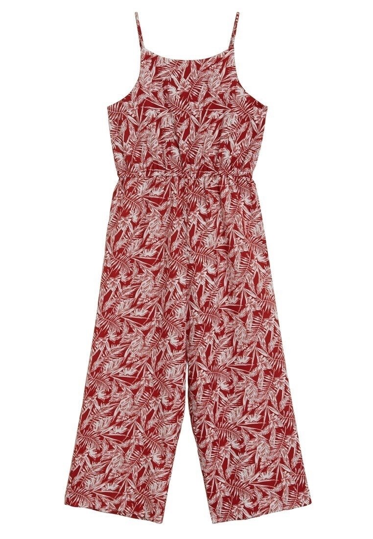Combinaison rouge avec un motif de feuilles blanches, bretelles fines réglables, taille élastique et coupe jambes larges. Tissu léger à la texture lisse.