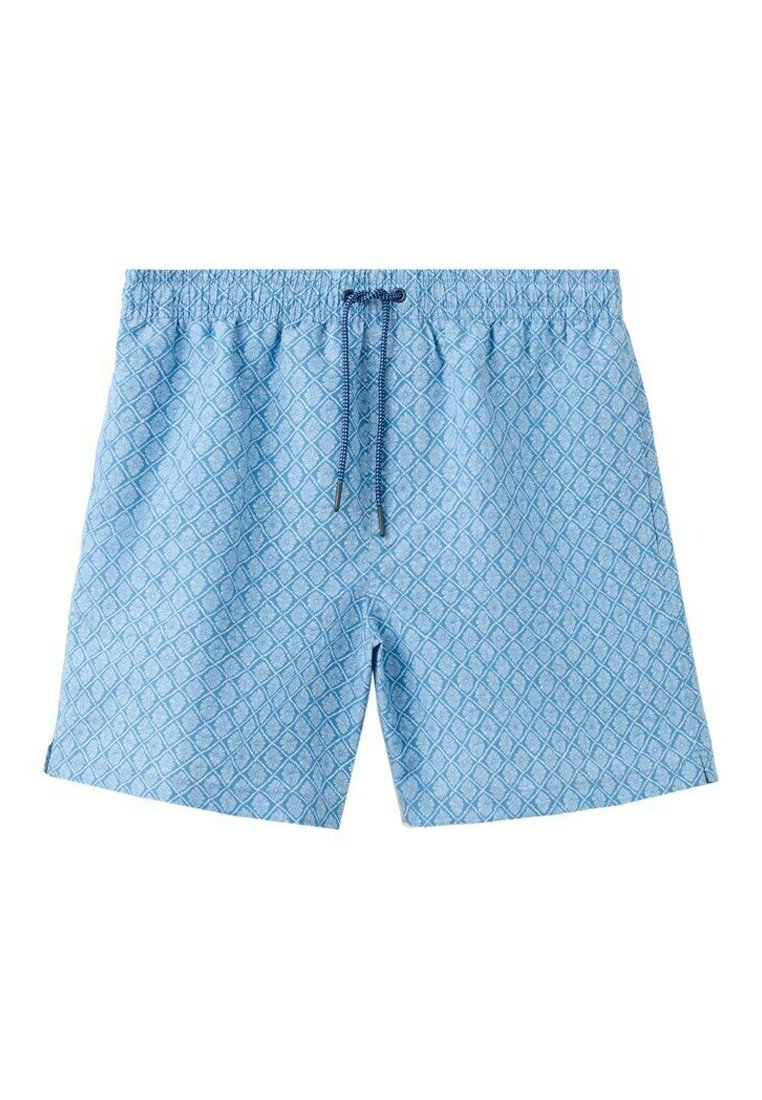 Shorts de bain pour hommes bleu clair avec motif en losange, taille élastique et cordon de serrage bleu foncé sur fond blanc.
