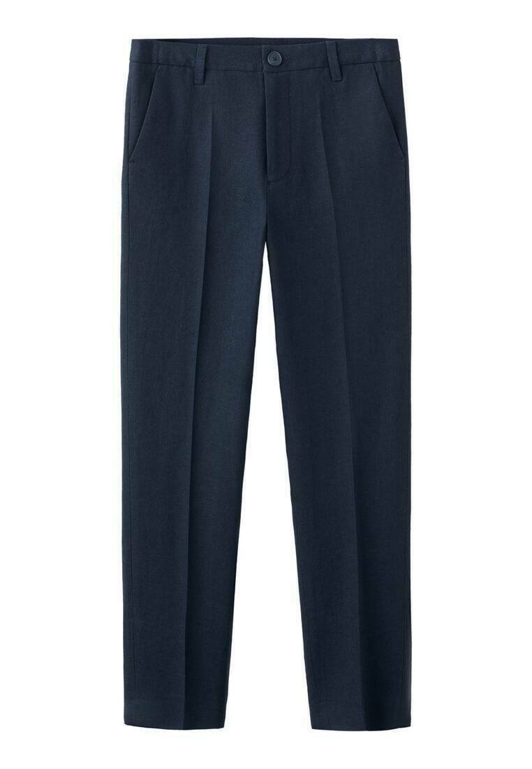 Pantalon bleu marine en tissu tissé avec une coupe droite. Comprend deux poches avant et un bouton unique à la ceinture. Texture lisse.