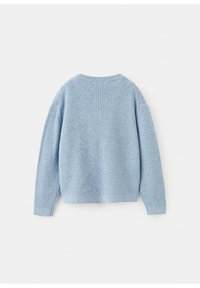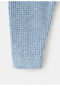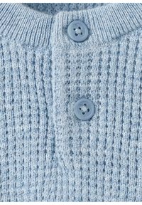 Pull tricoté bleu clair à manches longues avec texture en relief gaufré et deux boutons près de l'encolure ronde.