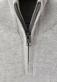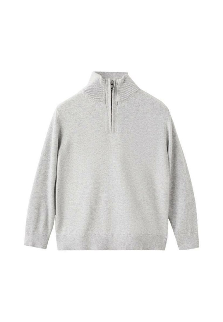 Pull-over gris clair avec un col montant côtelé et une fermeture éclair sur un quart. Texture en maille douce et manches longues, finition avec un ourlet côtelé.