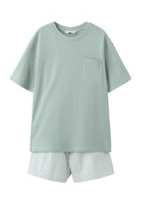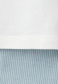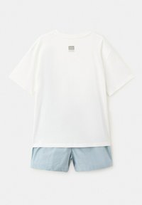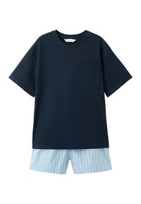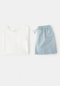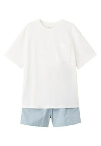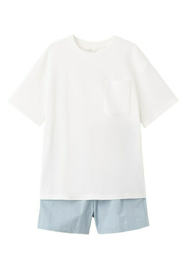 T-shirt blanc à manches courtes avec poche poitrine, associé à un short rayé bleu clair et blanc sur fond blanc.