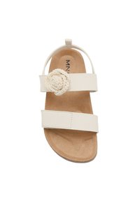 Sandale blanche à bout ouvert avec deux brides réglables, semelle intérieure en liège, semelle en caoutchouc et une fleur en crochet décorative sur la bride supérieure.
