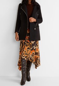 Femme portant un manteau noir zippé par-dessus un pull en tricot marron et une jupe à motifs aux couleurs noir, orange et beige.