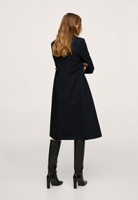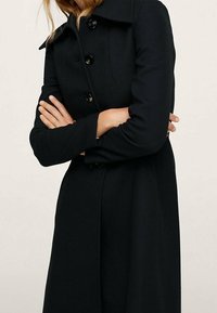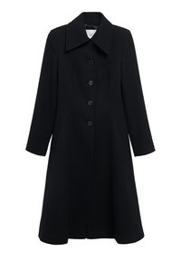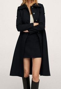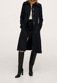 Manteau en laine noire à silhouette longue, grand col et fermeture à boutons. Associé à une jupe ajustée et des bottes noires montantes jusqu'aux genoux.