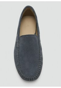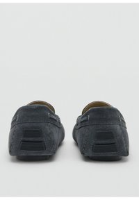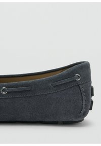 Mocassin en daim gris foncé avec couture mocassin, détail de lacet latéral et semelle en caoutchouc antidérapante, présenté en profil latéral.