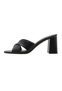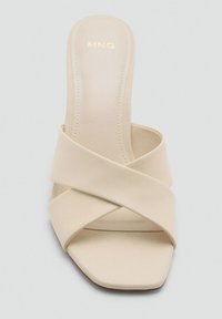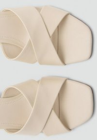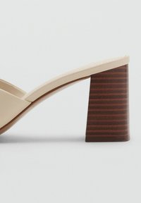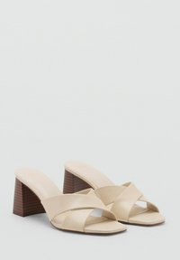 Sandale beige à talon ouvert avec larges brides croisées et un talon bloc en bois, vue de côté sur fond blanc.