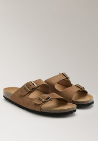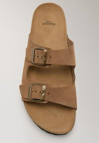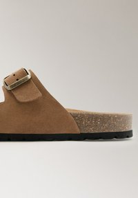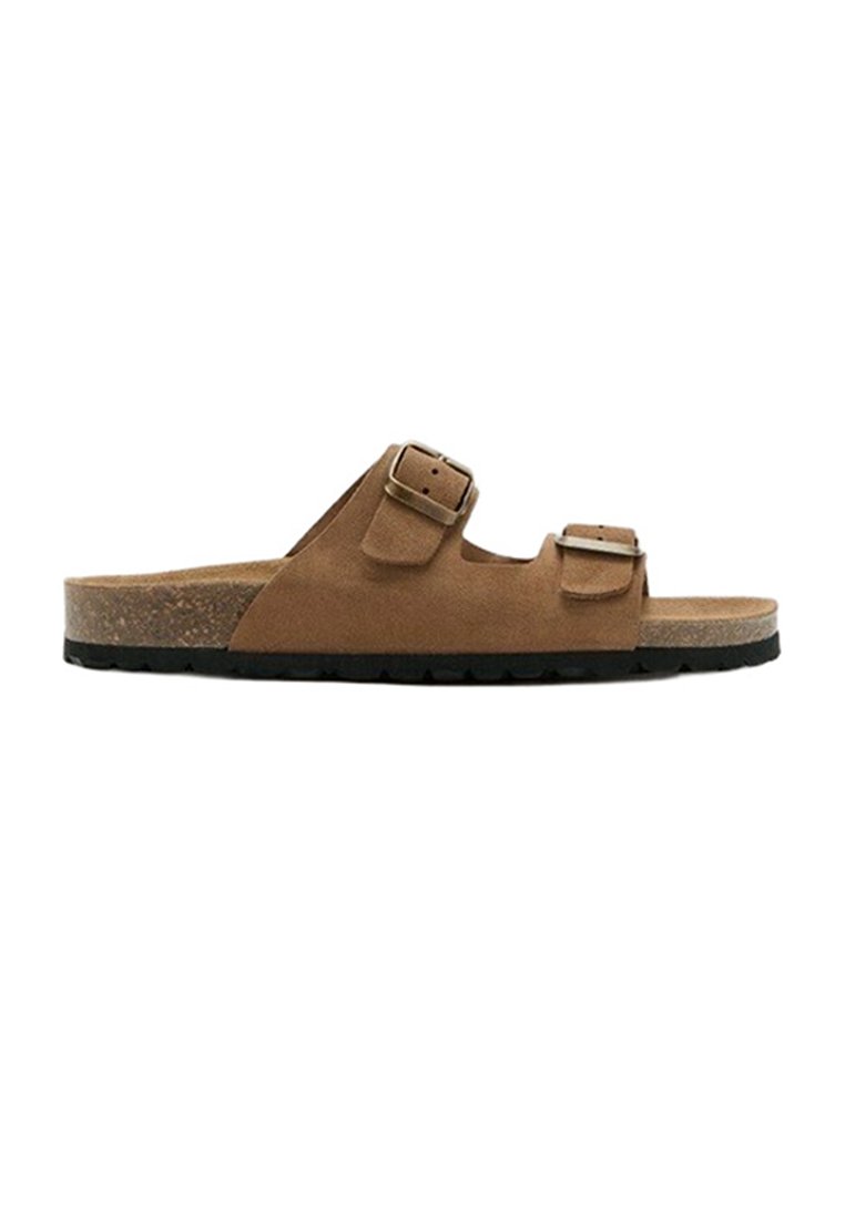 Sandale mule en suède marron avec deux brides réglables à boucle en métal et une semelle intérieure en liège moulé sur une semelle noire.