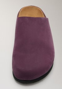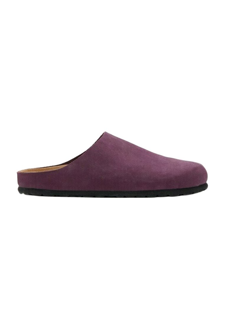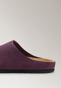 Mule à enfiler en daim violet avec bout fermé et semelle en caoutchouc noir, vue de profil sur fond blanc.