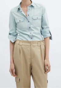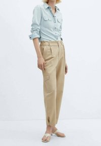 Pantalon cargo beige à coupe ample, design plissé, poches latérales et ourlet retroussé. Associé à une chemise boutonnée bleu clair.