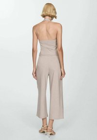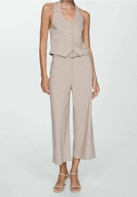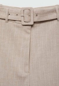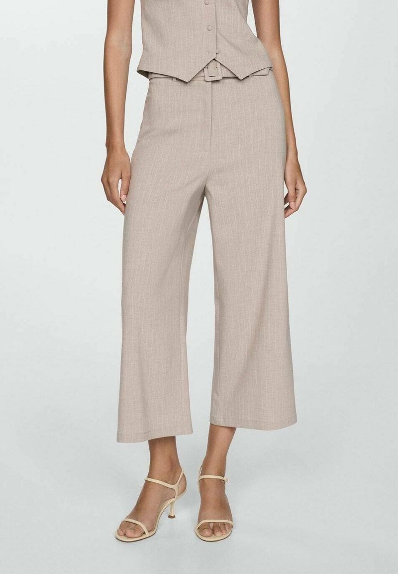 Pantalons larges beiges à rayures fines, taille haute avec une ceinture assortie. Associés à des talons légers et à lanières.