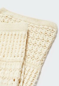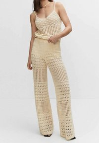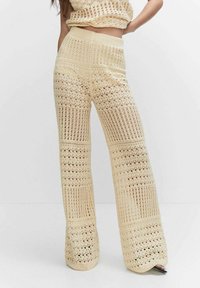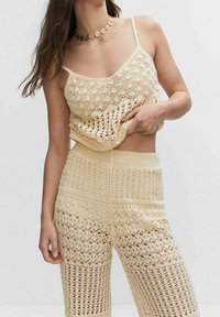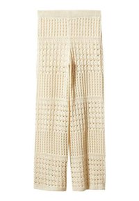 Pantalon en maille crochet jaune pâle, avec jambes larges, motifs ajourés complexes et taille haute, présentant une finition texturée.