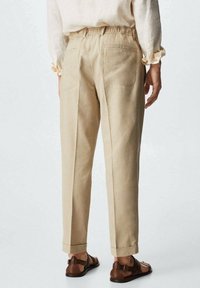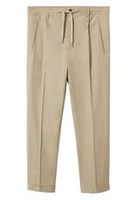 Homme portant un pantalon beige à cordon de serrage, un haut à manches longues crème et des sandales en cuir marron foncé, debout avec une main dans la poche.