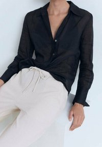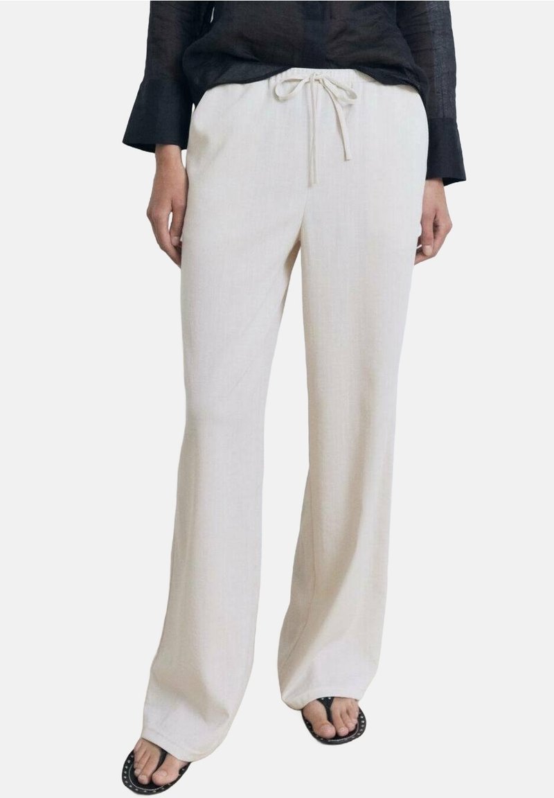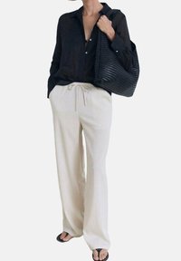 Femme portant un pantalon blanc ample à cordon de serrage et des sandales noires à bout ouvert, associé à un haut noir à manches longues.