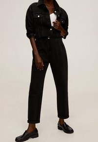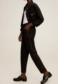 Pantalon en velours côtelé noir avec une ceinture élastique, coupe ample, ourlets retroussés, porté avec des mocassins noirs. Tissu texturé avec coutures visibles.