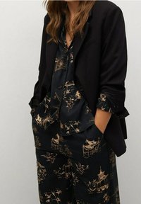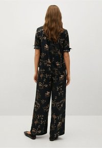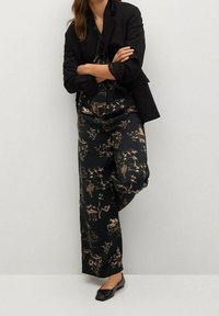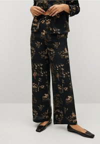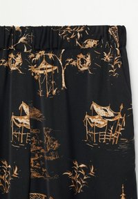 Pantalons larges noirs avec un imprimé doré inspiré de l'Asie, fabriqués en matériau léger. Assortis d'un haut coordonné et de ballerines noires.