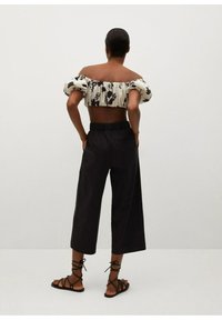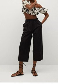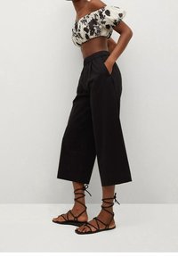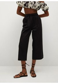 Pantalons noirs coupés avec une taille élastique haute, texture lisse et coupe droite. Associés à des sandales noires à lanières.