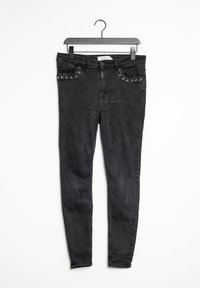 Jean noir en denim, avec une coupe ajustée, des œillets en métal argenté décoratifs le long des poches, et une fermeture éclair classique.