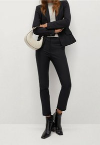Pantalon noir sur mesure avec une texture lisse, une coupe ajustée et une taille mi-haute, associé à des bottines noires pointues.
