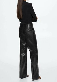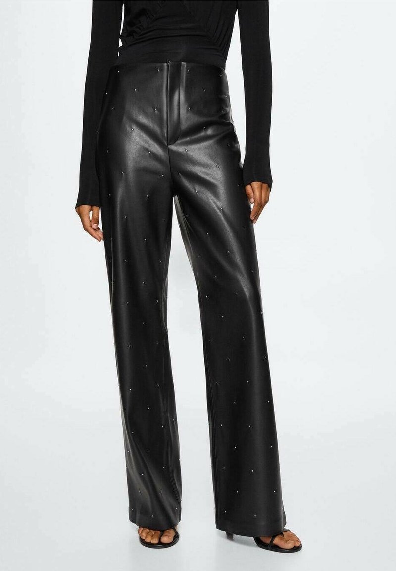 Pantalon large en cuir noir avec de petites incrustations de strass, une texture lisse, et une taille haute pour une coupe cintrée.