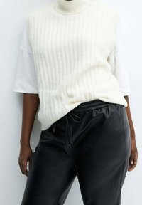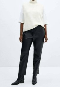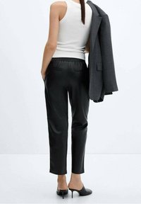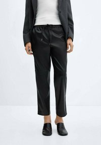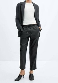Pantalon de jogging en cuir noir avec taille à cordon, coupe fuselée et texture lisse, associé à un blazer gris et des chaussures plates noires.