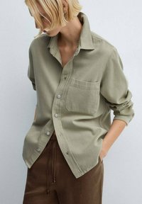 Pantalon marron court à coupe décontractée, taille à cordon de serrage, avec des détails en métal contrastants. Associé à une chemise vert clair et des mules beiges.