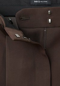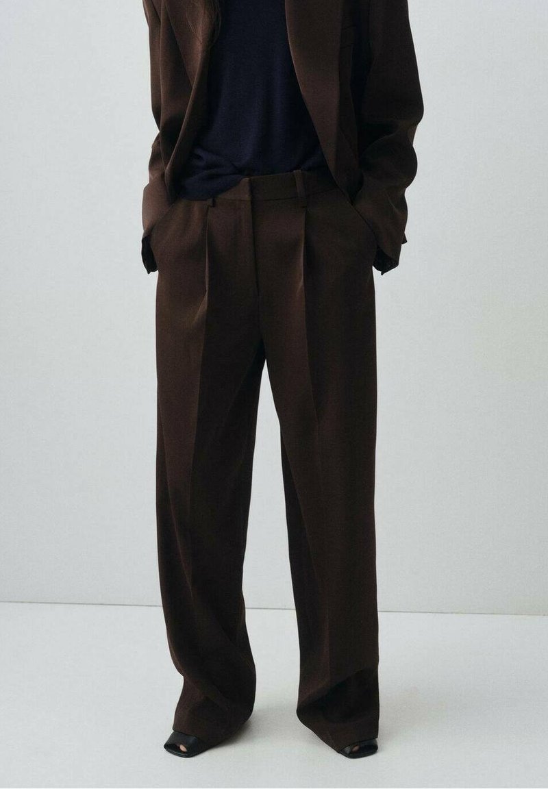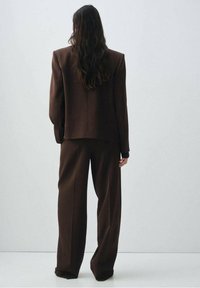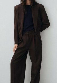 Personne portant un pantalon large marron foncé et un blazer assorti, un haut noir rentré à l'intérieur, les mains dans les poches, et des chaussures ouvertes noires.