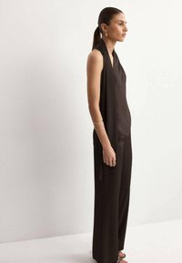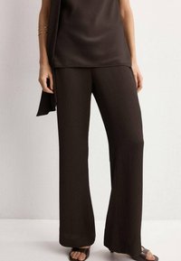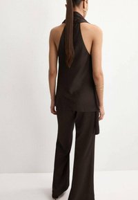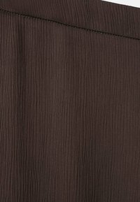 Haut marron côtelé et pantalon à jambes larges, en matière douce. Le haut présente un design drapé, tandis que le pantalon a une texture lisse et une coupe décontractée.