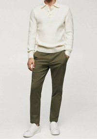Homme portant un pantalon slim vert olive, un pull blanc et des baskets blanches, debout devant un fond clair uni.