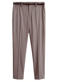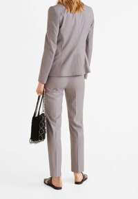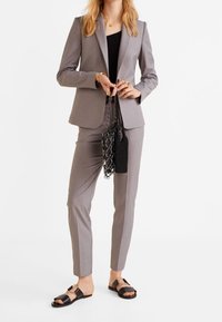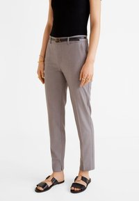 Pantalons gris ajustés avec une coupe slim, dotés d'une taille et de passants de ceinture, associés à des sandales noires plates et un haut noir ajusté.