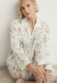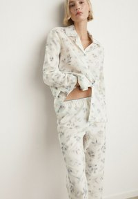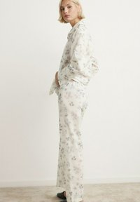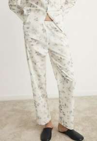 Femme portant un ensemble de pyjama en soie blanche avec un imprimé floral gris et des chaussures à enfiler noires, debout contre un mur blanc uni.
