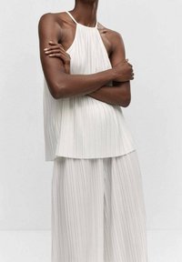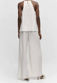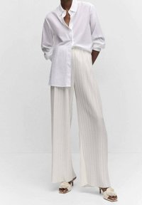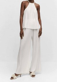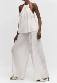 Pantalons larges plissés à taille élastique en beige clair avec une texture douce, associés à des sandales à glisser crémeuses ornées d'une fleur en tissu.