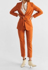 Costume sur mesure orange avec blazer à un bouton et pantalon taille slim. Blouse blanche en dessous, associée à des bottines crème.