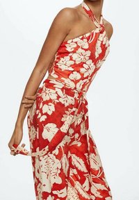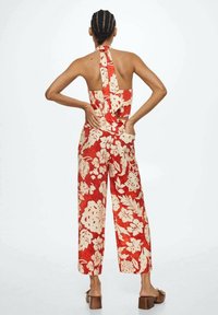 Femme portant un pantalon rouge à jambes larges avec un grand motif floral beige, associé à des sandales à talons ouvertes marron, debout devant un fond blanc.