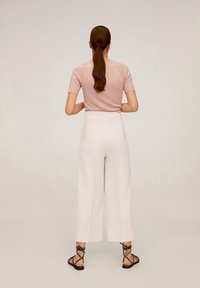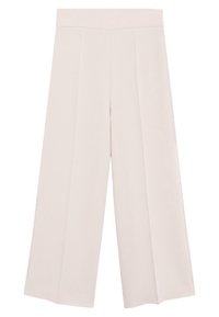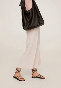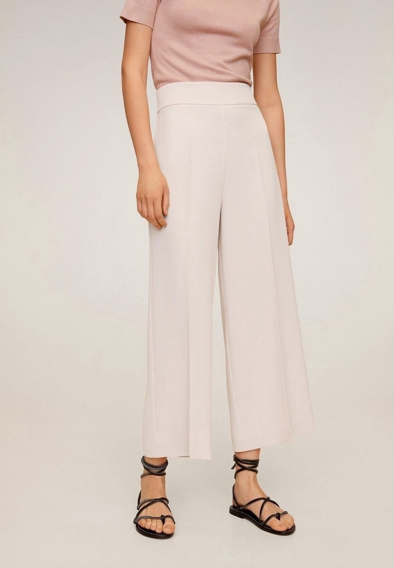 Pantalon large couleur beige clair avec une taille haute, présentant une texture lisse et des lignes épurées ; associé à des sandales noires à brides.