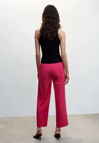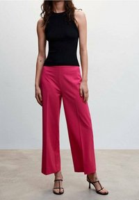 Pantalon large fuchsia à plis sur le devant, confectionné dans un tissu lisse. Porté avec un haut noir ajusté et des sandales fines noires.